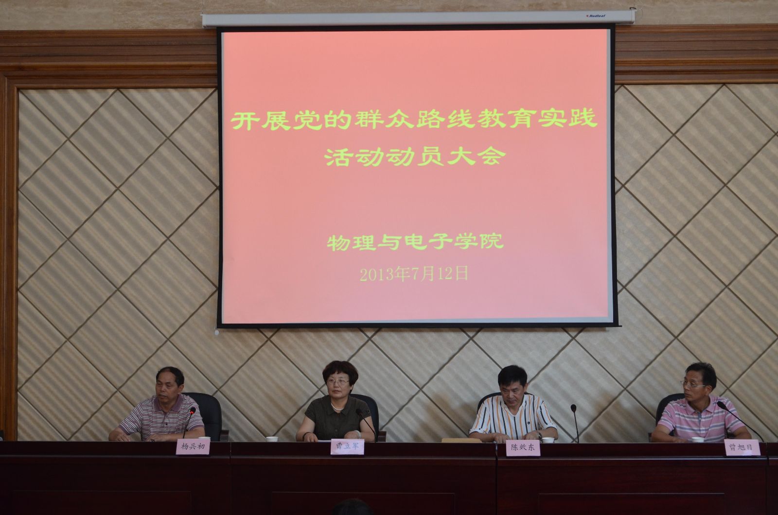 7月12日上午,胜游体育(SYsports)官方网站入口在新校区物理楼举行了包括全院教职工党员、胜游体育(SYsports)官方网站入口中层干部、退休党员代表、学生党员代表参加的“深入开展党的群众路线教育实践活动”动员大会。会上,院党委书记曾旭日作动员报告,并就活动的开展进行部署。学校第六督查组组长、法胜游体育(SYsports)官方网站入口原党委书记曹立军,学校第六督查组副组长、学校工会副主席陈效东到场指导。会议由院长杨兵初主持。
