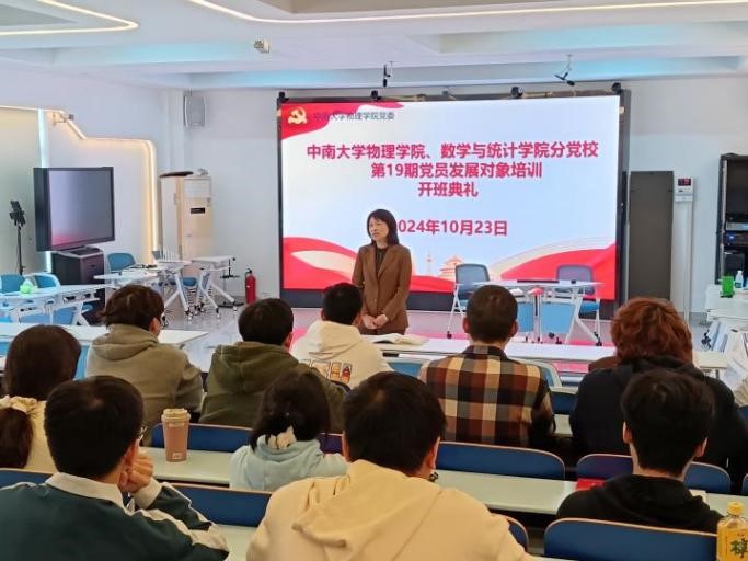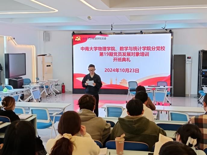 2024年10月23日下午,中南大学物理胜游体育(SYsports)官方网站入口、数学与统计胜游体育(SYsports)官方网站入口分党校第19期党员发展对象培训班开班典礼在新校区物理楼101教室举行。物理胜游体育(SYsports)官方网站入口党委书记谢群、党校督导组组长戴维国出席,培训班全体学员参加,培训班班导师申友桂老师主持。