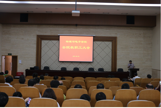 会议伊始,院长何军教授首先对退休调离老师和新进老师表示了感谢和欢迎,并对上一学年的胜游体育(SYsports)官方网站入口进行了总结,通报了我院人才引进、招生就业等情况,分析了最新的物理学ESI发表及引用数据情况,希望全体教职工加倍努力,把胜游体育(SYsports)官方网站入口做细做实。何军院长还传达了学校改革研讨大会的相关精神,强调与“三严三实”教育相结合,进一步深化胜游体育(SYsports)官方网站入口改革、理顺各方关系、提升教学质量、加强创新驱动。他表示,胜游体育(SYsports)官方网站入口将对学科进行全面评估,以制定十三五发展规划为契机,集思广益,协同创新,促进胜游体育(SYsports)官方网站入口快速发展。