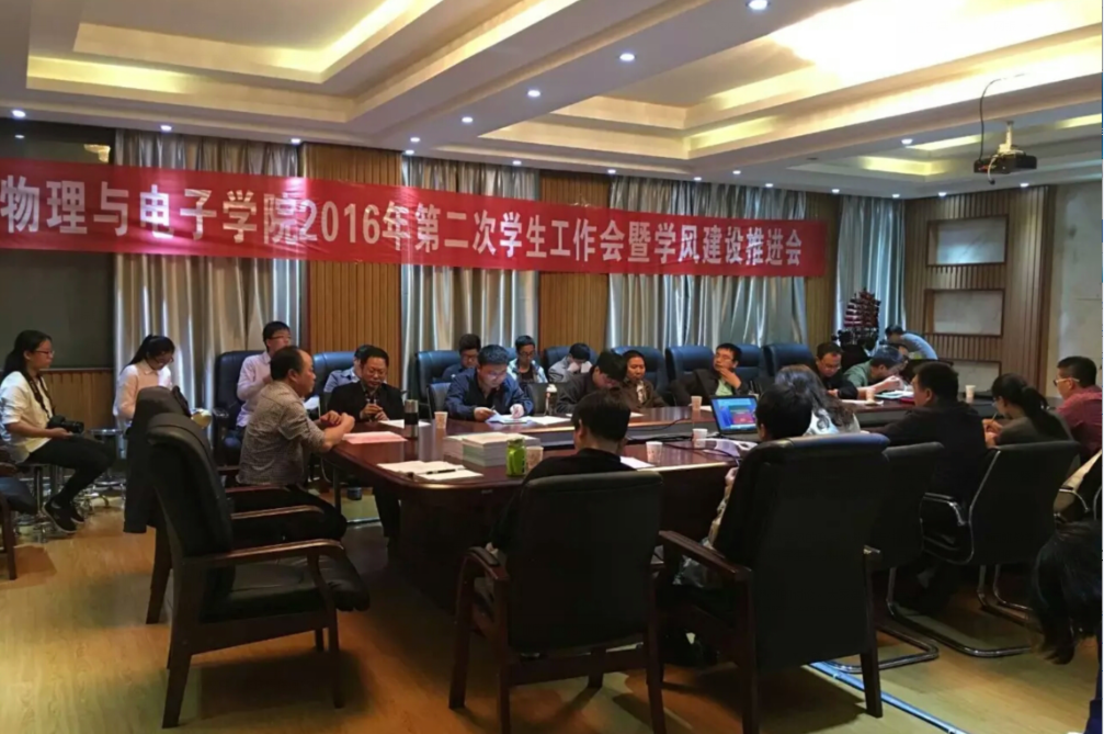为进一步贯彻落实学校“优化学风建设,提高教学质量”推进会精神,全面落实全员育人机制,10月19日下午3:00,胜游体育(SYsports)官方网站入口2016年第二次学生胜游体育(SYsports)官方网站入口会议暨学风建设推进会在物理楼345会议室召开。全体院领导,各系(所)、中心主任、支部书记、分管教学的副主任,教师代表,辅导员,班导师,本科生及研究生代表参加了本次会议。