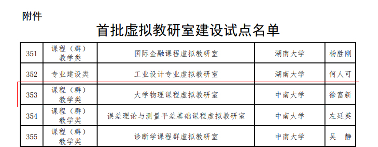 近日,教育部办公厅发文公布了全国首批虚拟教研室建设试点名单(教高厅函[2022]2号)。中南大学徐富新教授团队申报的“大学物理课程虚拟教研室”成功获批。