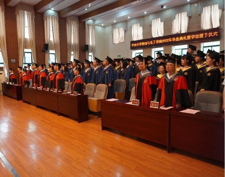 (通讯员 张子睿)6月15日上午,我院在物理楼116报告厅隆重举行2022年毕业典礼暨学位授予仪式。院领导李登伶、孙克辉、谢群、李长庚、徐富新、龙孟秋、邓联文、阳军亮,国家级人才孟建桥、袁永波、刘敏、王辉,毕业年级班导师,全体辅导员出席仪式,与2022届全体毕业生共同见证这一重要时刻。毕业典礼由院党委副书记谢群主持。
