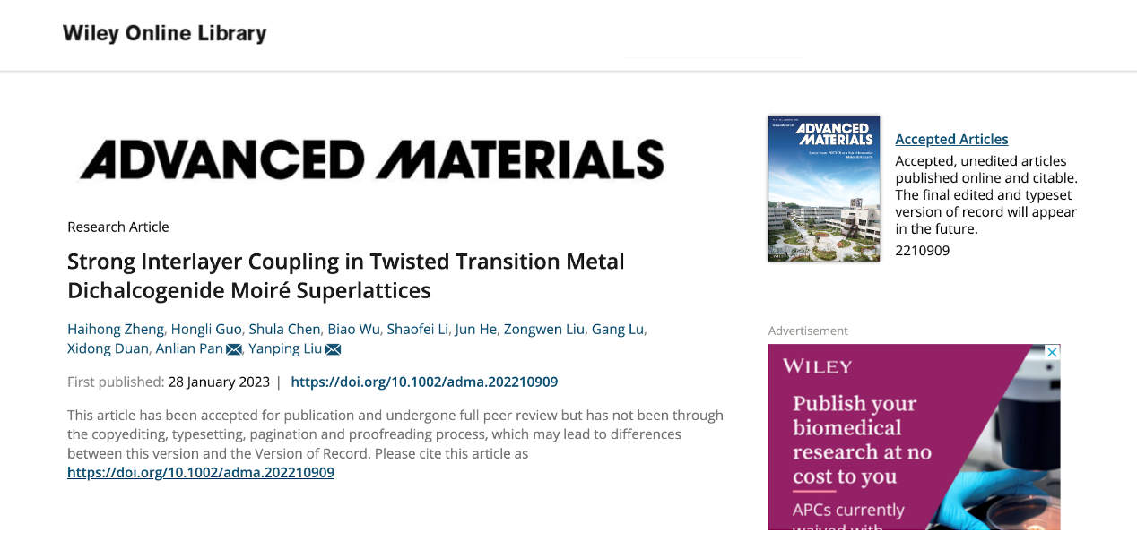 近日, 中南大学胜游体育(SYsports)官方网站入口刘艳平、何军教授与美国加州州立大学北岭分校(CSUN)Gang Lu、澳大利亚悉尼大学(TUS)刘宗文、湖南大学潘安练、段曦东教授等国内外学者合作,在国际顶级期刊Advanced Materials(影响因子:32.08)上发表题为“TMDCs莫尔超晶格层间耦合效应的量子调制”(Strong interlayer coupling in twisted transition metal dichalcogenide moiré superlattices)的研究论文。中南大学胜游体育(SYsports)官方网站入口为该项研究成果的第一完成单位,博士后郑海红博士为论文第一作者,刘艳平教授为论文的通讯作者。