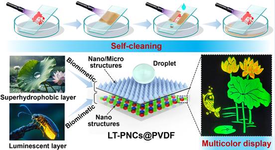 研究团队提出了一种基于飞秒激光直写(FsLDW)技术的仿生多级结构制造策略,利用飞秒激光超短脉冲与高能量密度特性精准控制表面温度,诱导钙钛矿晶体定向生长,形成发光优异的图案化阵列。针对钙钛矿本征稳定性不足,创新性提出双层仿生策略:激光烧蚀使表面形成类似荷叶的微纳分级结构,结合激光诱导含氟官能团富集及PVDF固有低表面能实现超疏水;同时,PVDF的低导热性在亚表面为CsPbX3量子点提供温和结晶环境,避免热分解,并通过激光调控实现全光谱可调多色荧光。最终制备的超疏水多色钙钛矿薄膜具备全光谱发射、优异柔性、高分辨率和自清洁能力,在复杂天气下表现出优异的耐用性(图1)。该进展以“Femtosecond Laser Atomic–Nano–Micro Fabrication of Biomimetic Perovskite Quantum Dots Films toward Durable Multicolor Display”为题于2025年6月19日发表在《ACS Nano》。