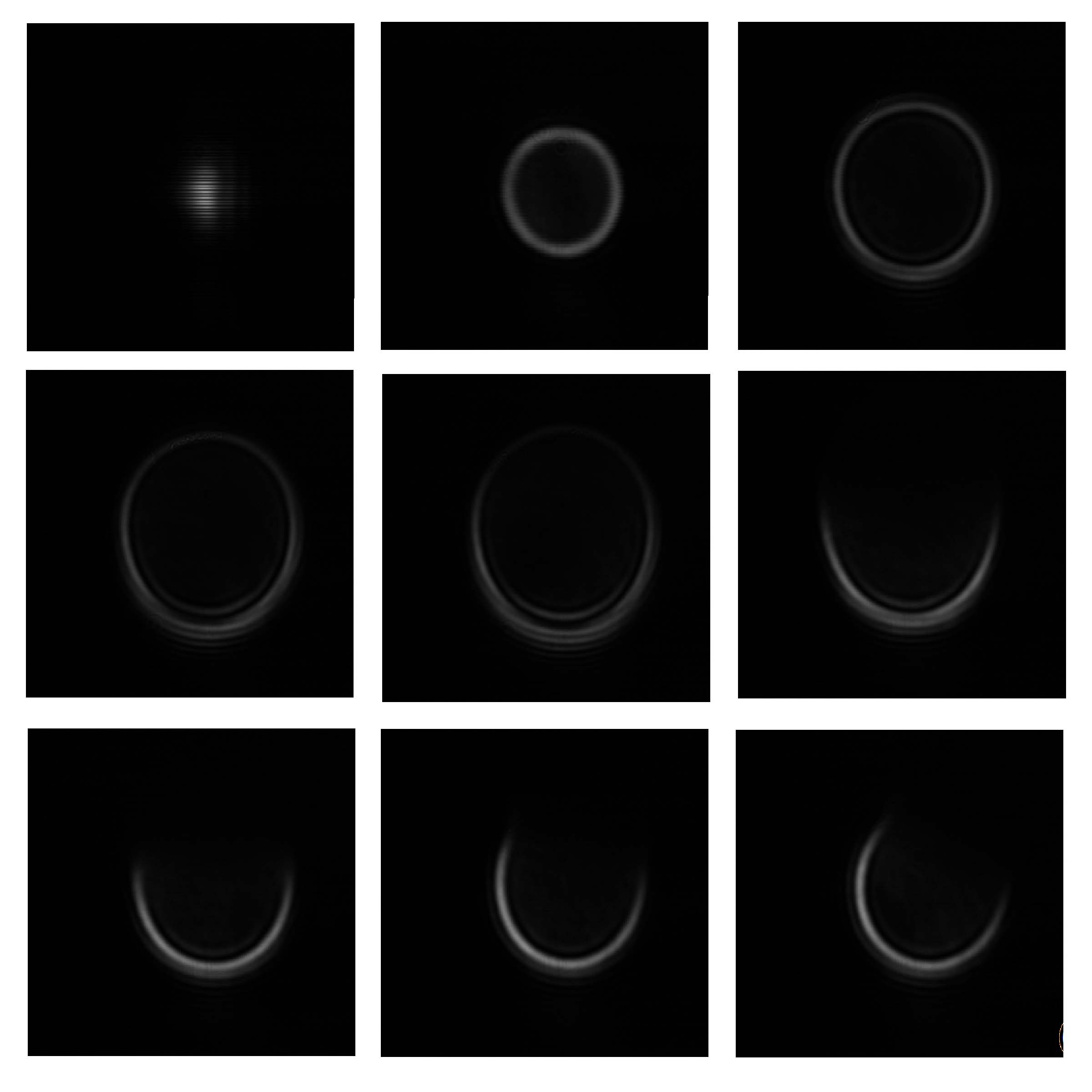该论文主要报道了激光在MoS2悬浮溶液中的动态自衍射现象,并进行了动态数据分析模拟。观测结果表明自衍射现象分为三个阶段(如附图):第一阶段为激光透射光斑由高斯分布变成对称衍射环,主要机制猜测为激光作用占主要地位;第二阶段为衍射环在竖直方向上变为不对称,机理猜测为重力占主要地位作用;第三阶段为衍射环在水平方向上变为不对称,机理猜测为激光精细结构决定衍射环不对称性。通过自衍射三个阶段的完成时间和终态观测分析,可以证明自衍射现象的形成快慢与激光强度、溶液粘滞度和MoS2纳微碎片的浓度有关。对动态的衍射图像进行模拟,可以得出溶液中纳微碎片在激光作用下的动态分布。