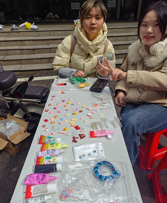 活动伊始,组织成员们为活动场地铺上了专属的幸运色,成员们对着身着“当日幸运色”衣物的女生进行物品发放。随着活动的持续进行,DIY手工制品的推出点燃了同学们的热情。DIY的发卡,手链款式多样,样式精致,赋予了制作者极大的创造空间。一件件的精美的小物品中融入了希望与关怀,也是女生们送给自己的一份精美礼物。