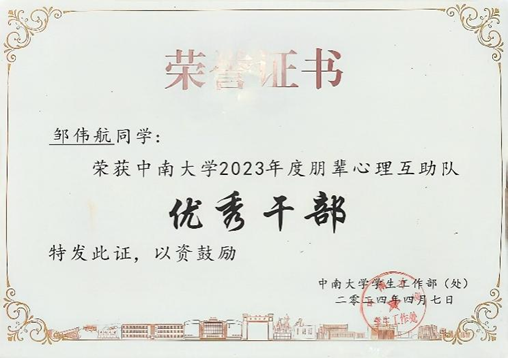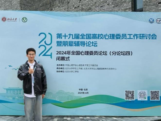 我院22级学生邹伟航作为中南大学学生代表参加第十九届全国高校心理委员胜游体育(SYsports)官方网站入口研讨会暨朋辈辅导论坛,荣获出席参加全国心理委员论坛证书(因相关政策要求,证书不再是“百佳心理委员”),获得《全国百名心理委员风采展》著作一本。