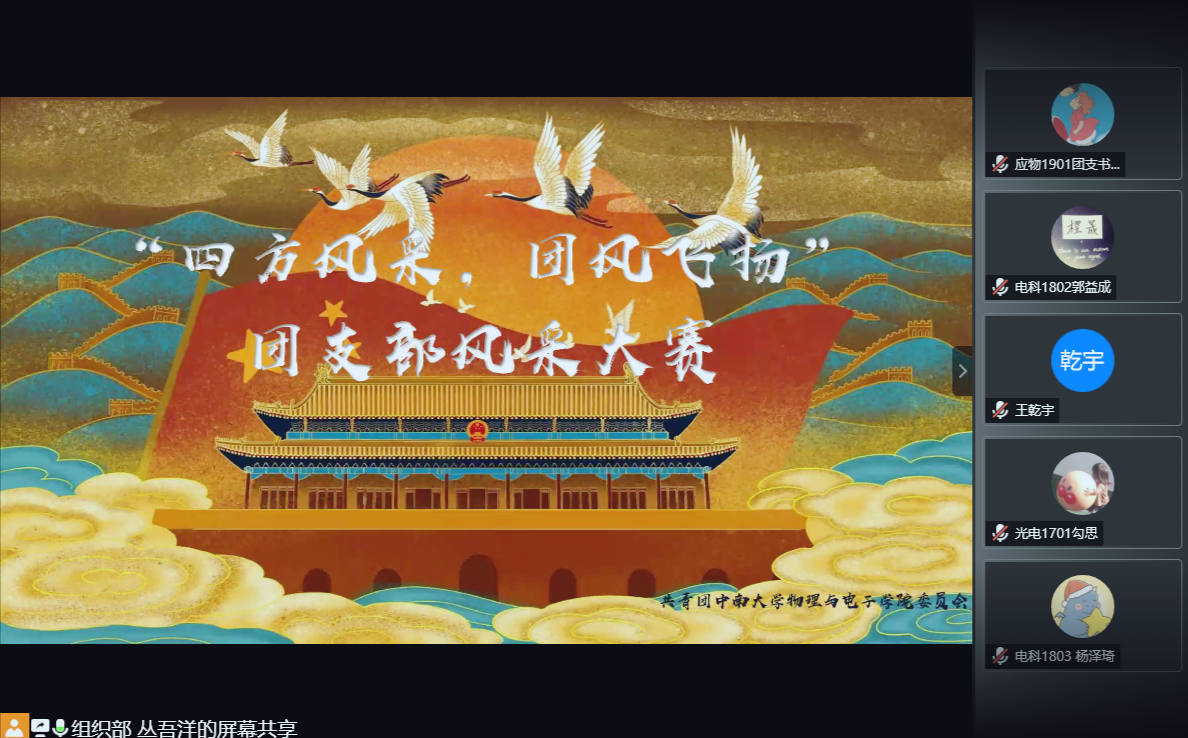 各团支部围绕班风建设、团日活动、支部荣誉、文体活动、学风建设以及积极抗疫等多个方面,以PPT、短视频等形式进行了精彩的团支部风采展示。其中抗疫主题团日活动的开展是本次大赛的一大亮点,许多团支部都积极组织同学们通过录制抗疫加油视频等方式为武汉加油,并通过团课宣传抗疫知识。各团支部在学风建设、思想引领、团建活动、社会实践等各个方面也都展现出积极的作风与不同的特色。经过激烈角逐,应物T1901、电科1804团支部荣获一等奖,电信1904等3个团支部荣获二等奖,光电1801等6个团支部荣获三等奖。