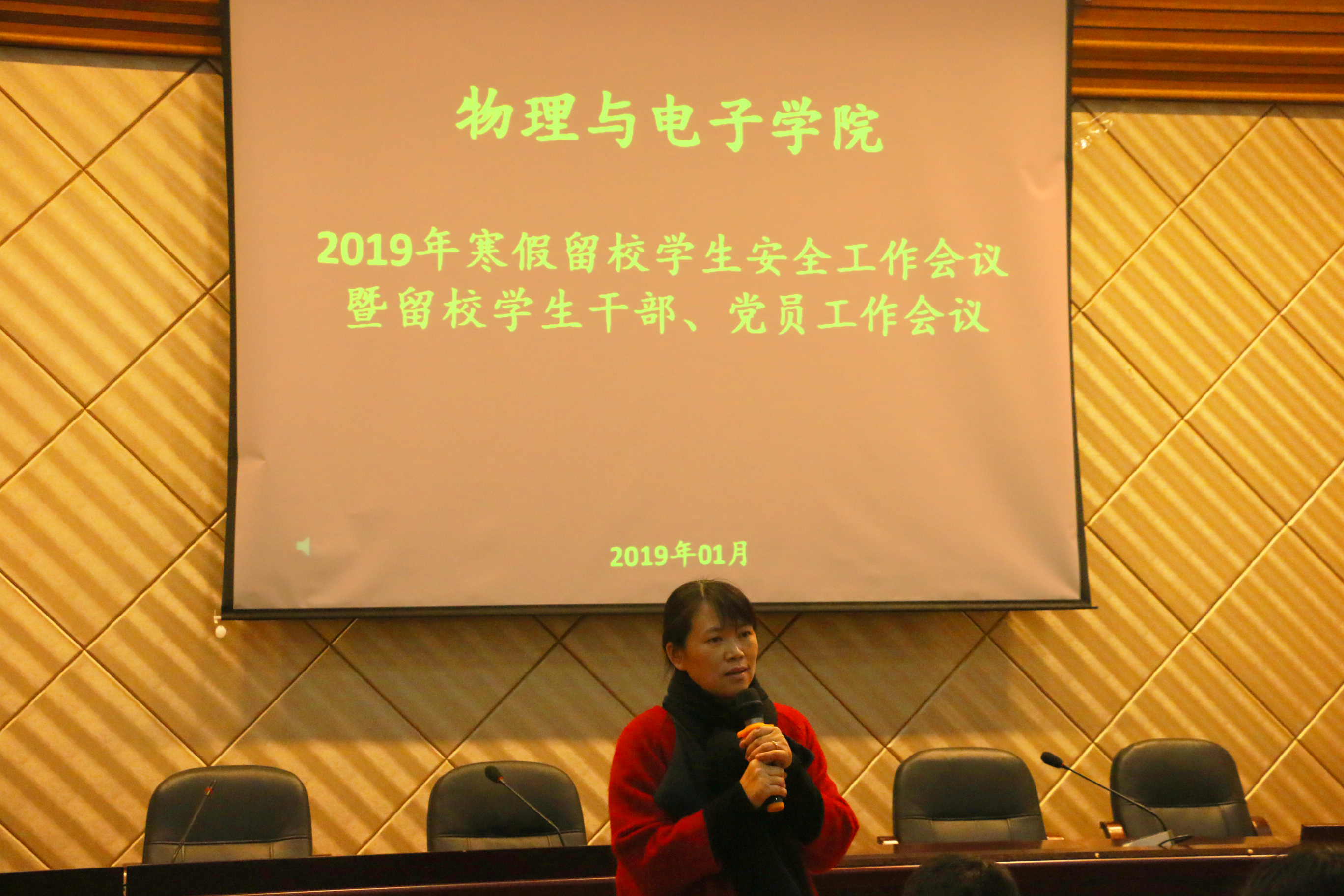 1月21日上午,胜游体育(SYsports)官方网站入口2019年寒假留校学生安全胜游体育(SYsports)官方网站入口会议暨留校学生干部、党员胜游体育(SYsports)官方网站入口会议在物理楼116报告厅举行。物电院党委副书记谢群,全体辅导员及全体寒假留校学生参加了会议。会议由辅导员邬永嘉主持。