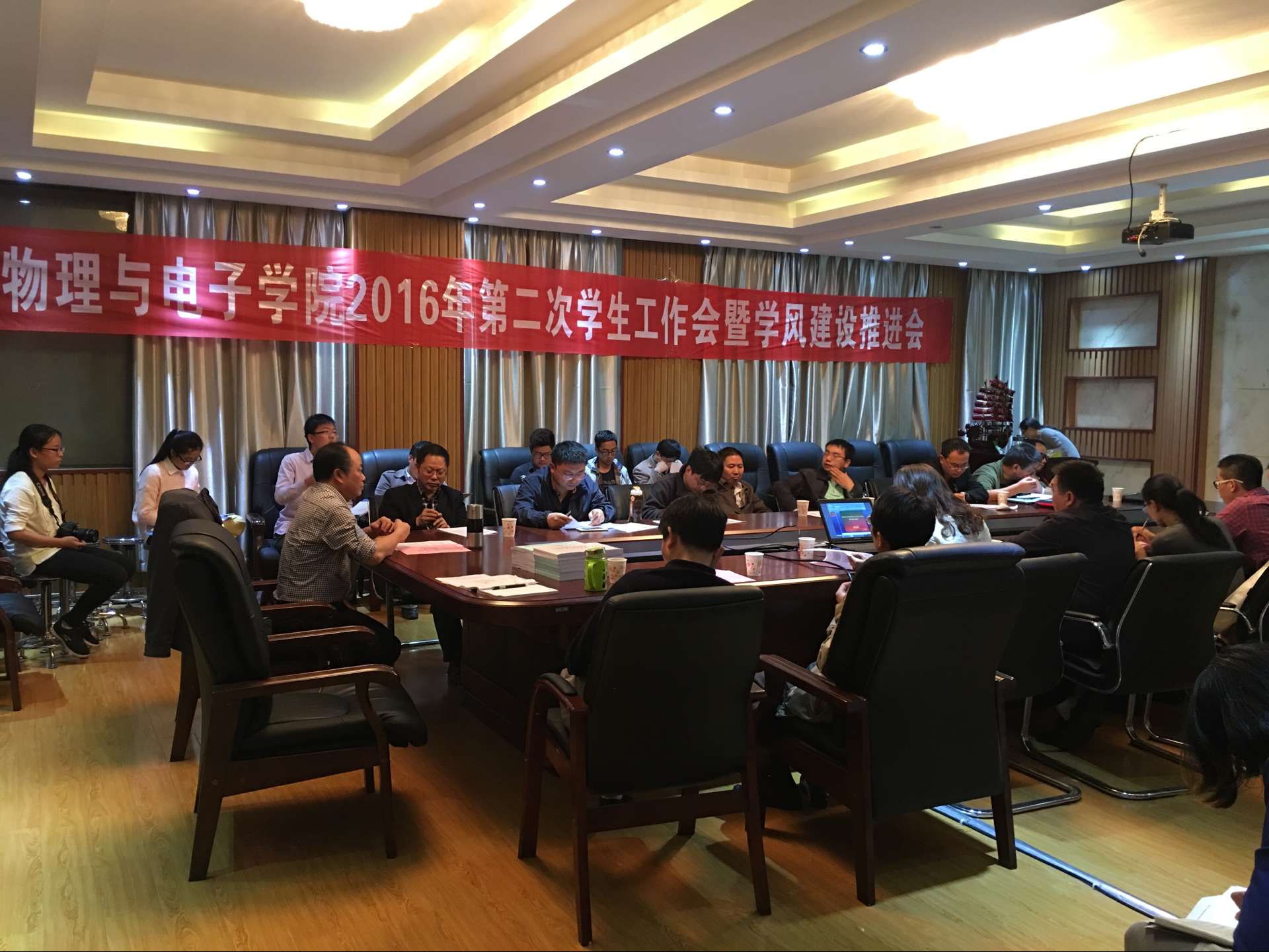 为进一步贯彻落实学校“优化学风建设,提高教学质量”推进会精神,全面落实全员育人机制,10月19日下午3:00,胜游体育(SYsports)官方网站入口2016年第二次学生胜游体育(SYsports)官方网站入口会议暨学风建设推进会在物理楼345会议室召开。全体院领导,各系(所)、中心主任、支部书记、分管教学的副主任,教师代表,辅导员,班导师,本科生及研究生代表参加了本次会议。