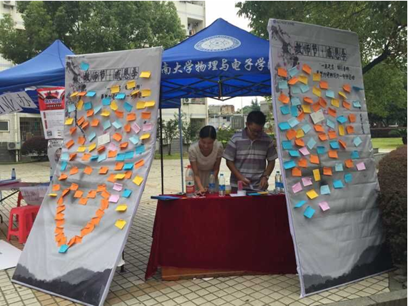 升华广场,同学们在留言板上是为老师写下真诚祝福。物理院电科1305班一位同学这样写道:“粉笔灰在讲台上飘扬,智慧的花朵在教室里开放,暮然回首,讲台下已是桃李满天下。我亲爱的老师,今天的您最美,祝您节日快乐!”参与组织的林同学说,这样的活动意在提供一个让同学们表达谢意的平台,希望每个学生对老师的感激不仅仅是言语,而是行动。