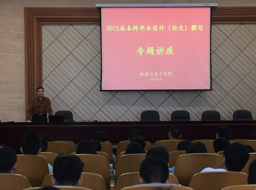 5月12日下午3点,胜游体育(SYsports)官方网站入口“2015届本科生毕业设计(论文)撰写专题讲座暨毕业生大会”在物理楼一楼报告厅成功举行。本次讲座由刘雄飞教授主讲。副院长孙克辉教授、胜游体育(SYsports)官方网站入口教务办王旭红老师、辅导员陈芳老师及就业专干赖广文老师出席了大会。