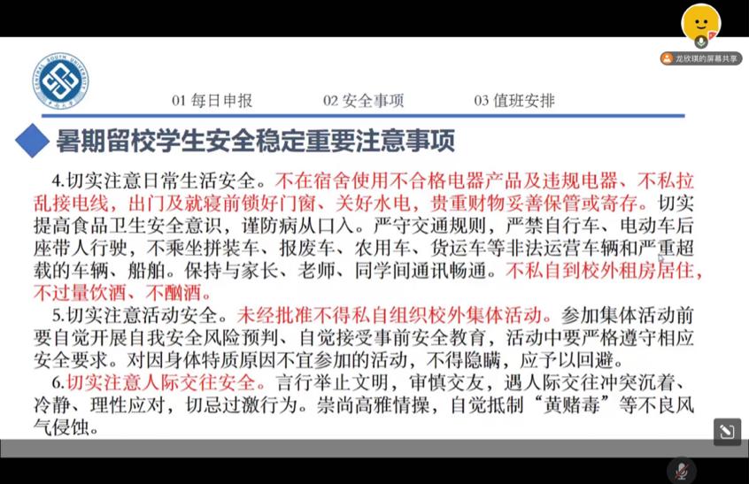 辅导员龙欣琪老师对暑期留校相关事宜进行说明。她从每日健康打卡申报、安全注意事项、负责人值班安排等方面展开,为留校同学宣读留校注意事项。
