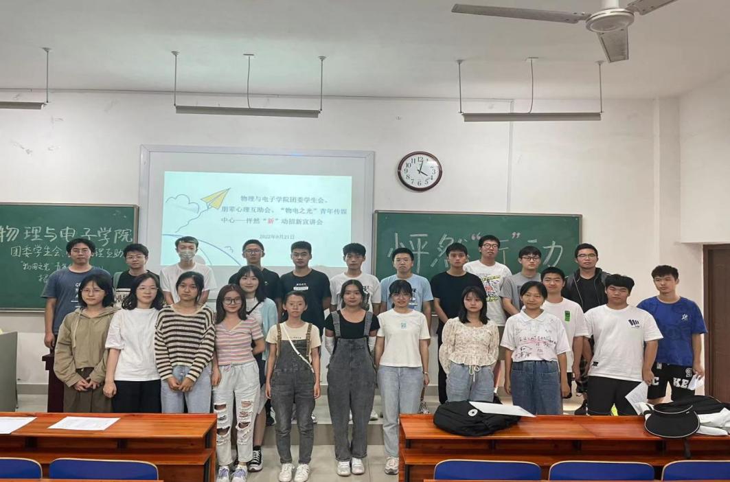 (通讯员 张子睿 陈炫烨)9月23日下午,我院团委学生会、朋辈心理互助会、“物电之光”青年传媒中心招新宣讲会在新校区物理楼124顺利举行。2022级辅导员欧阳旖旎老师出席本次宣讲会,各组织负责人、部门代表与2022级新生参与会议。宣讲会由电科2003班杜亚明主持。