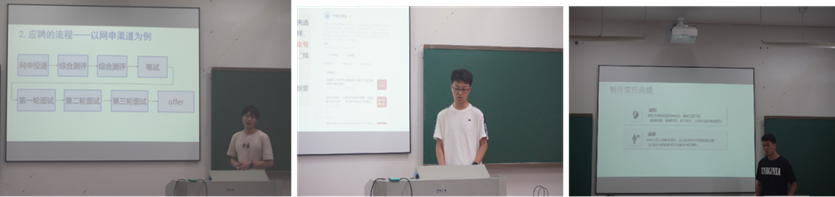 吕俊树就选调生考试进行了经验分享,他从报考条件和考试流程、选岗、笔试、面试经验和他的心得体会五个方面进行了详细的介绍,让同学们对公考选调的学习流程和方法有了系统性的认识和了解。游星雨首先提问了现场同学对就业的兴趣,接着从就业方向入题,向同学们详细介绍了当前光电专业学生的就业现状和可供选择的岗,他详细分享了自己了解企业和参加宣讲会的经验,大大增加了同学们对就业的信心。苏延念直接从就业流程分享自己的经验,他概括了自己制作简历的方式,强调了简历需要突出的重点。在投递流程分享中,他介绍了不同公司投递内容的特点,经过他的介绍,同学们对就业的细节方面有了更深层次的了解。