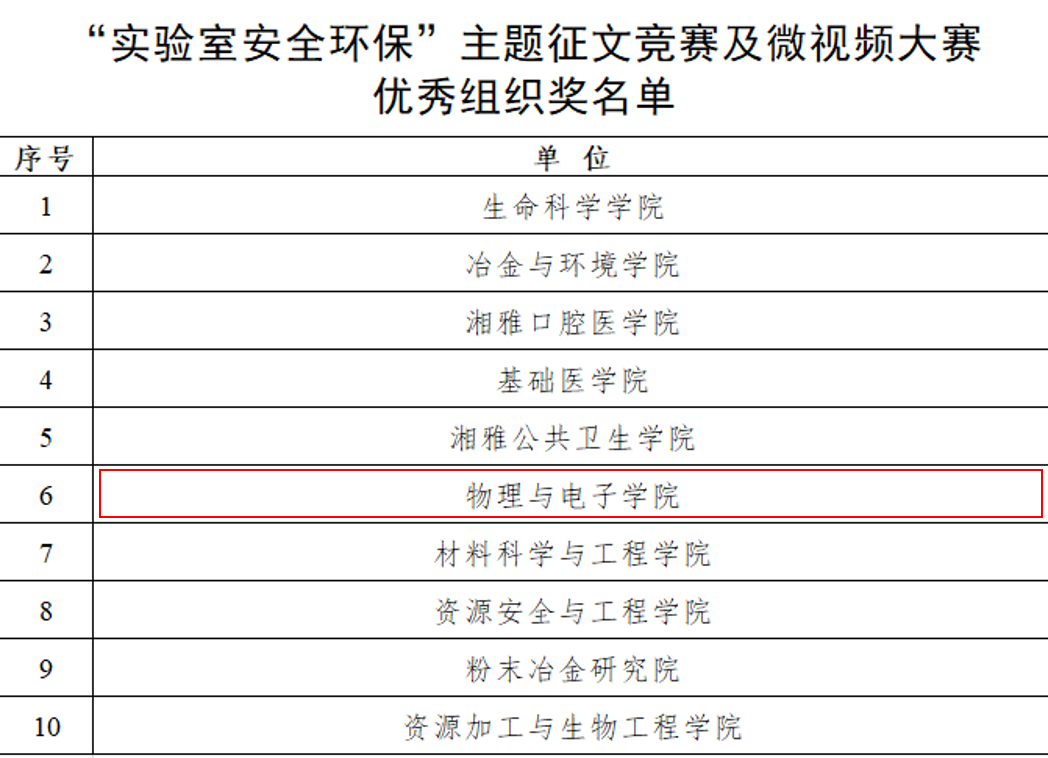 日前,学校资产与实验管理处公布了“实验室安全环保”主题征文竞赛和微视频大赛的评审结果,我院有13件作品获奖,获奖数量居全校前列。胜游体育(SYsports)官方网站入口同时获得优秀组织奖。中南大学“实验室安全环保”主题征文竞赛和微视频...