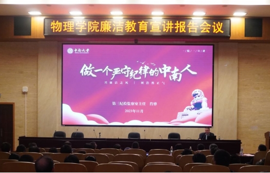 11月8日下午,我院在物理楼116报告厅召开廉洁教育宣讲报告会。学校纪委第三纪检监察室主任肖睿作主题为“做一个严守纪律的中南人”的廉洁教育宣讲报告。会议由院党委副书记安少波主持,全院教职工参加会议。 肖...